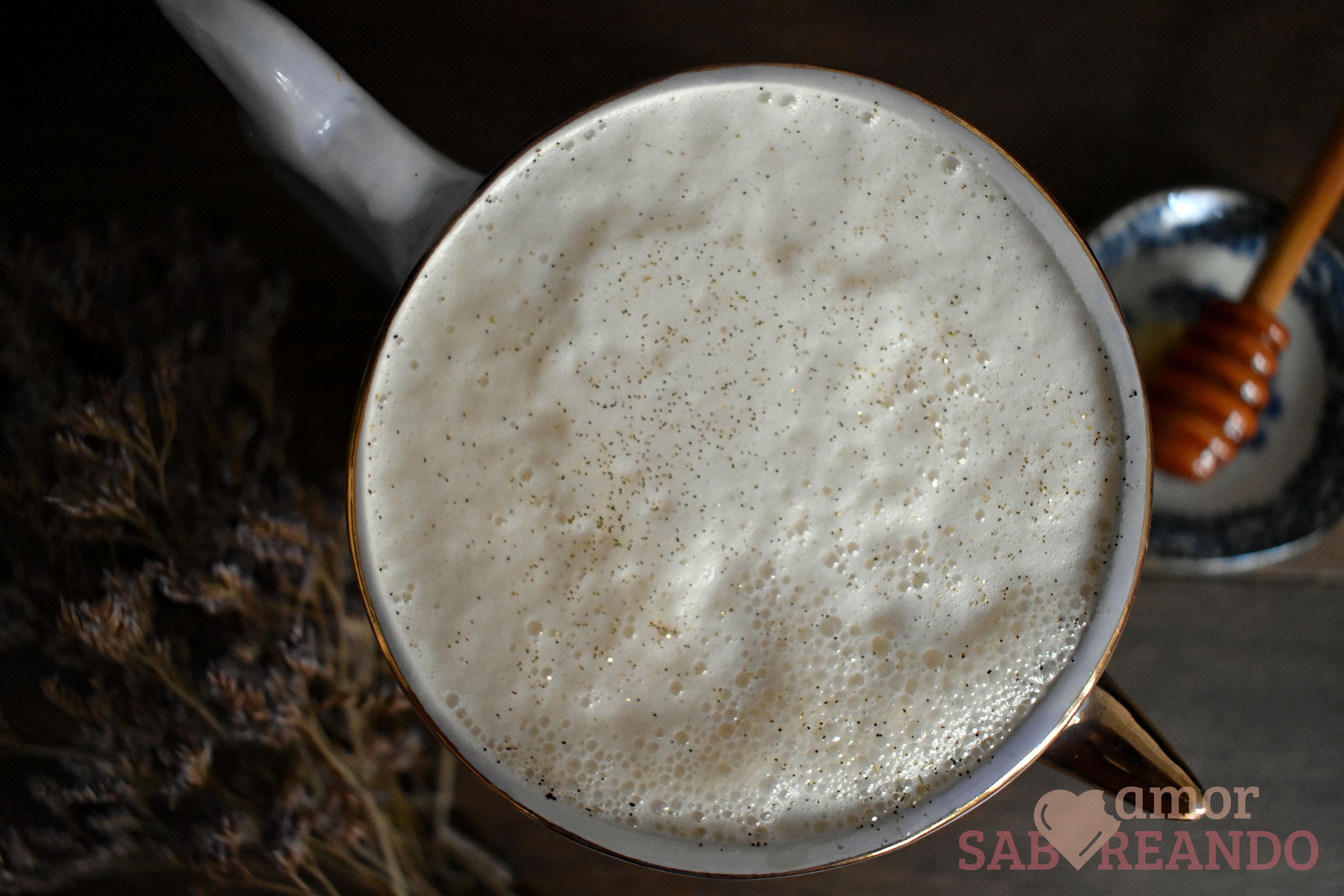- Retira los sobres de té, los trozos de la vaina y sirve 3/4 de la preparación en una taza, el resto espúmala con ayuda de un batidor, prensa francesa o espumador. Vacía la espuma en la taza y endulza con la miel.