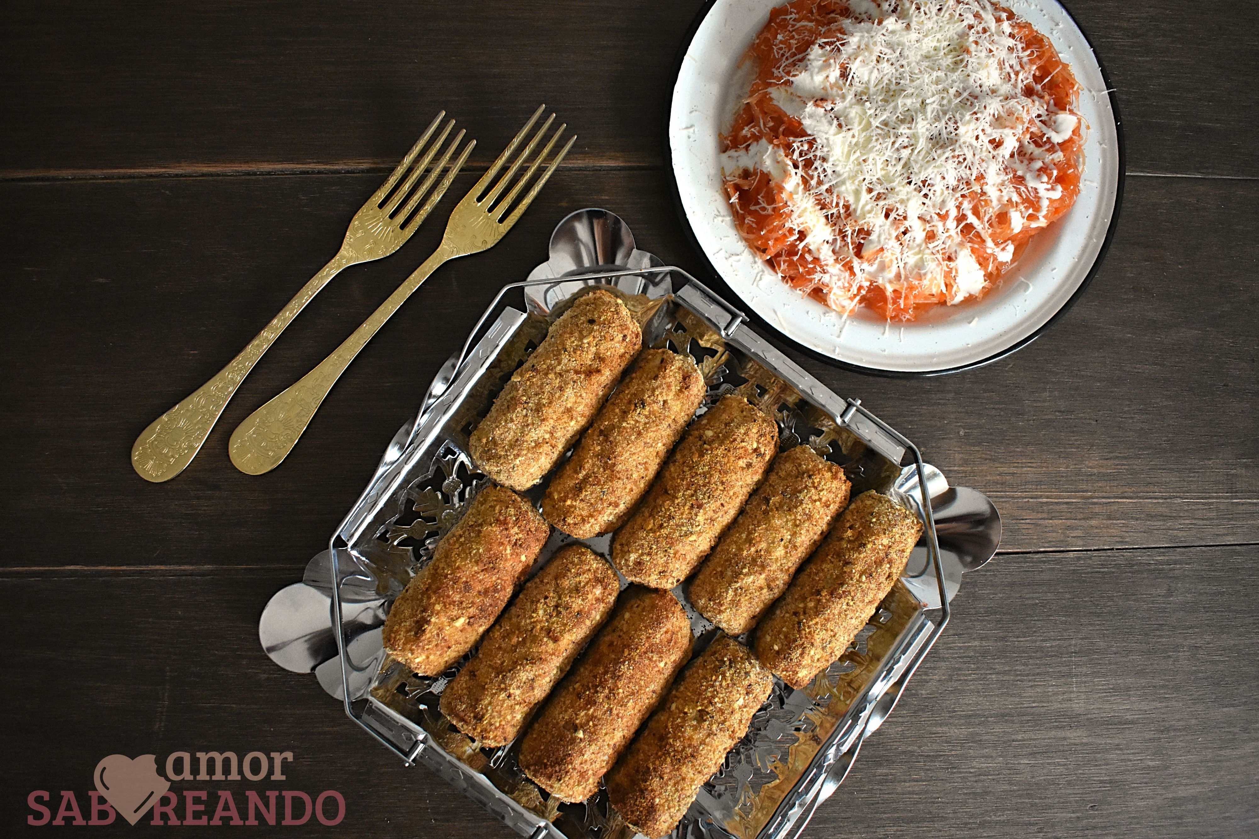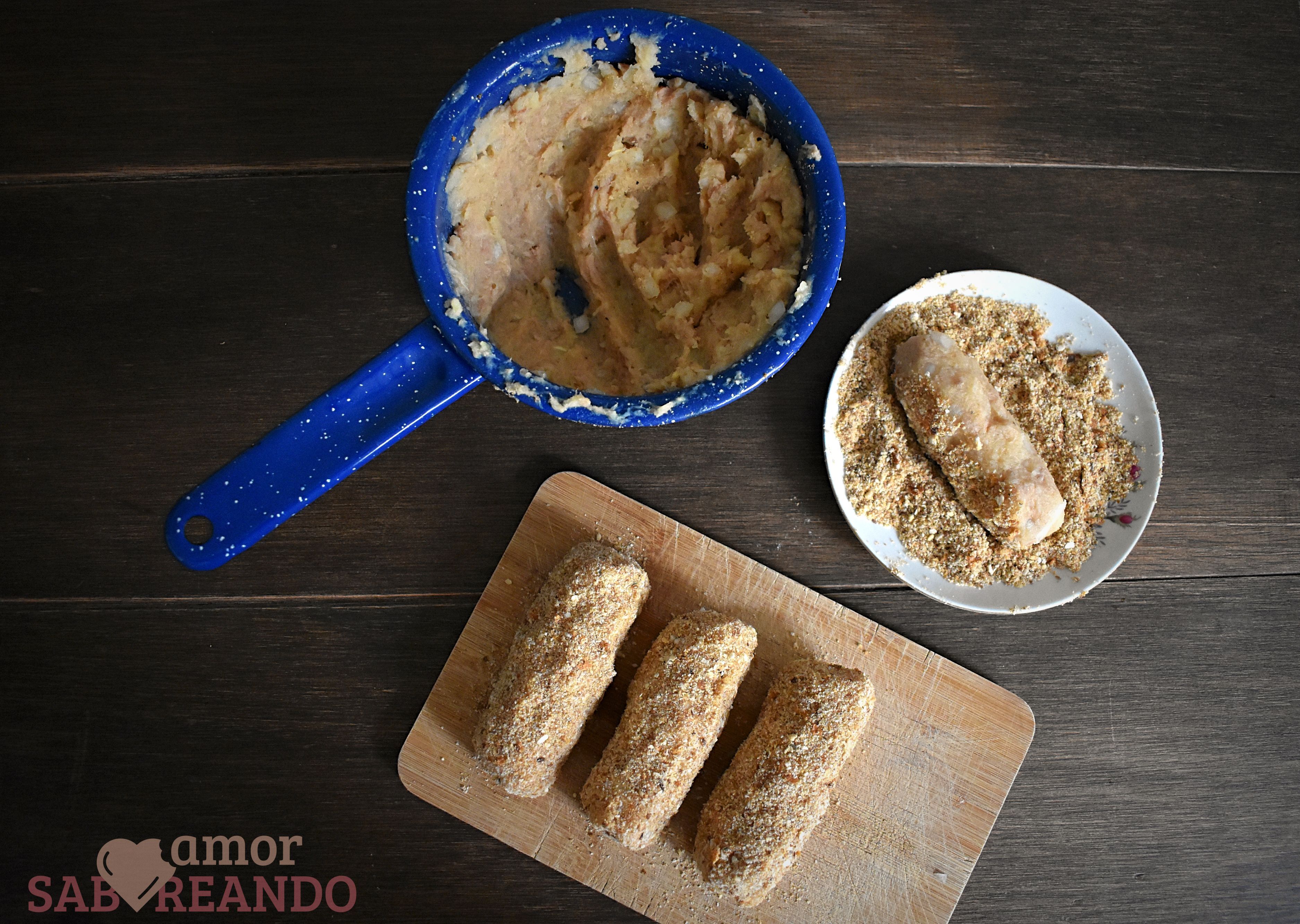 - Con ayuda de tus manos ve formando las croquetas y pásalas por el pan molido, a mi me gusta hacerlas en forma de cilindros alargados.