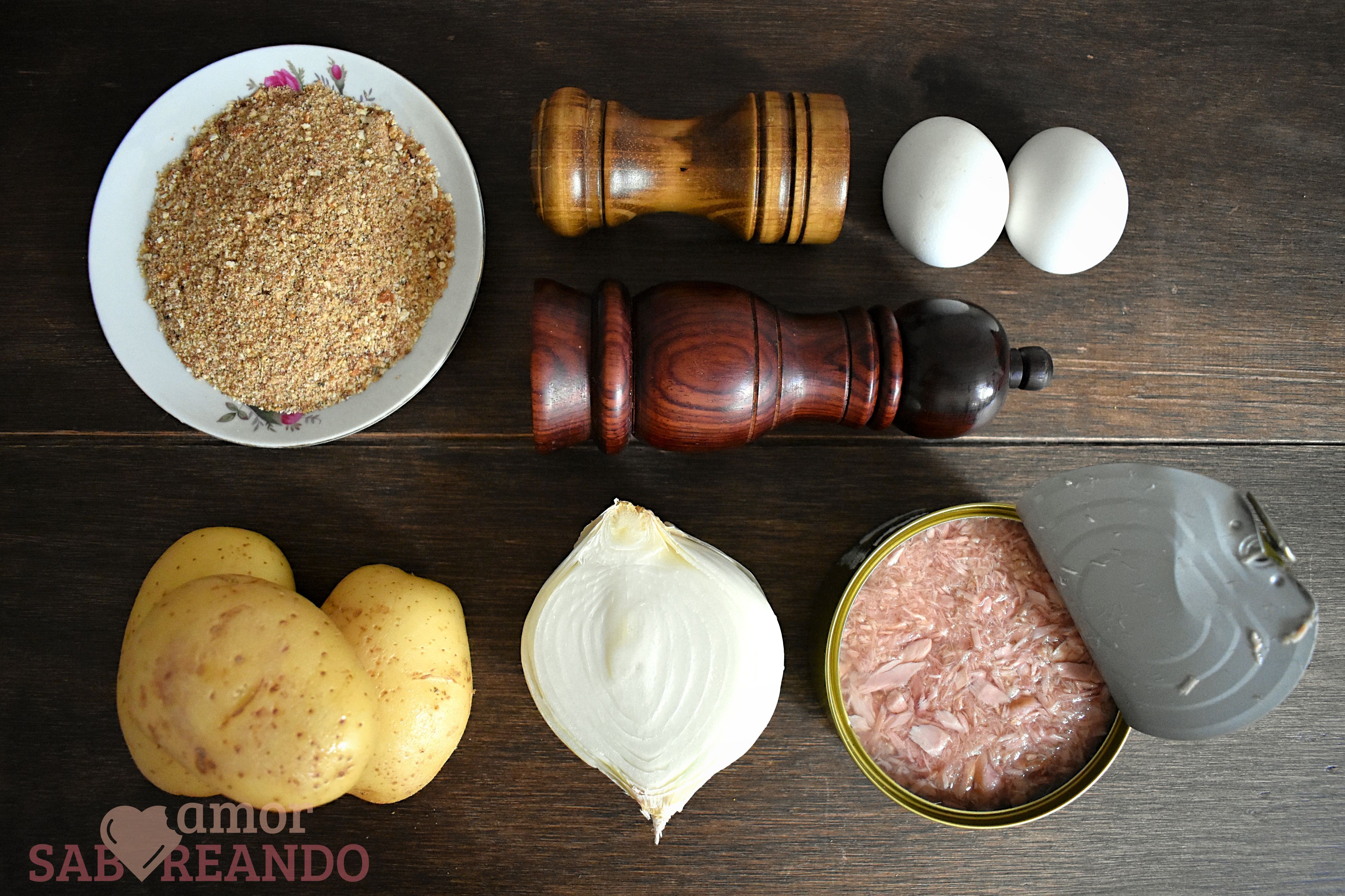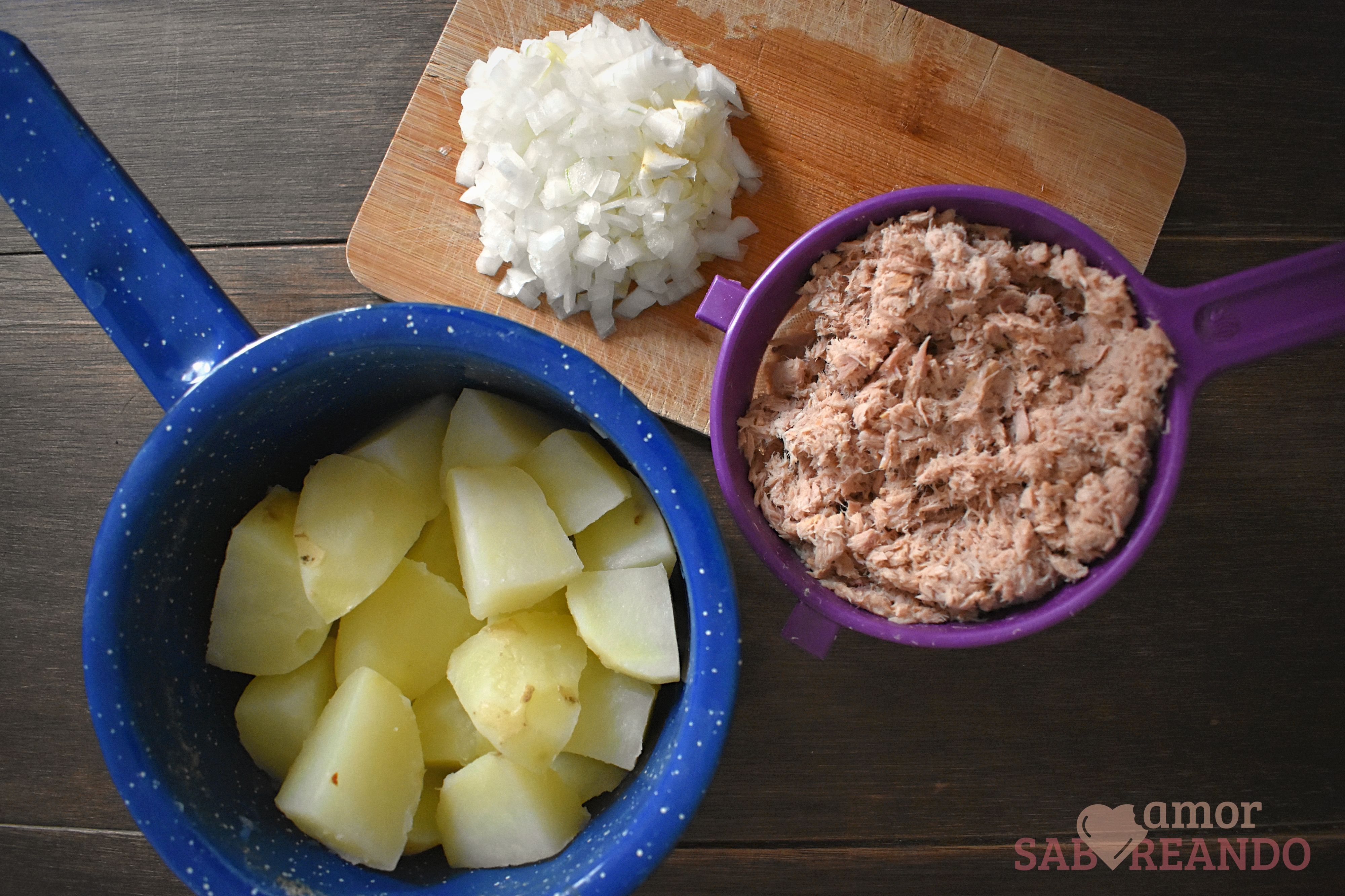 - Pica la cebolla en cuadritos pequeños, escurre la lata de atún e incorpora ambos ingredientes al puré de papa. Sazona al gusto con sal y pimienta.