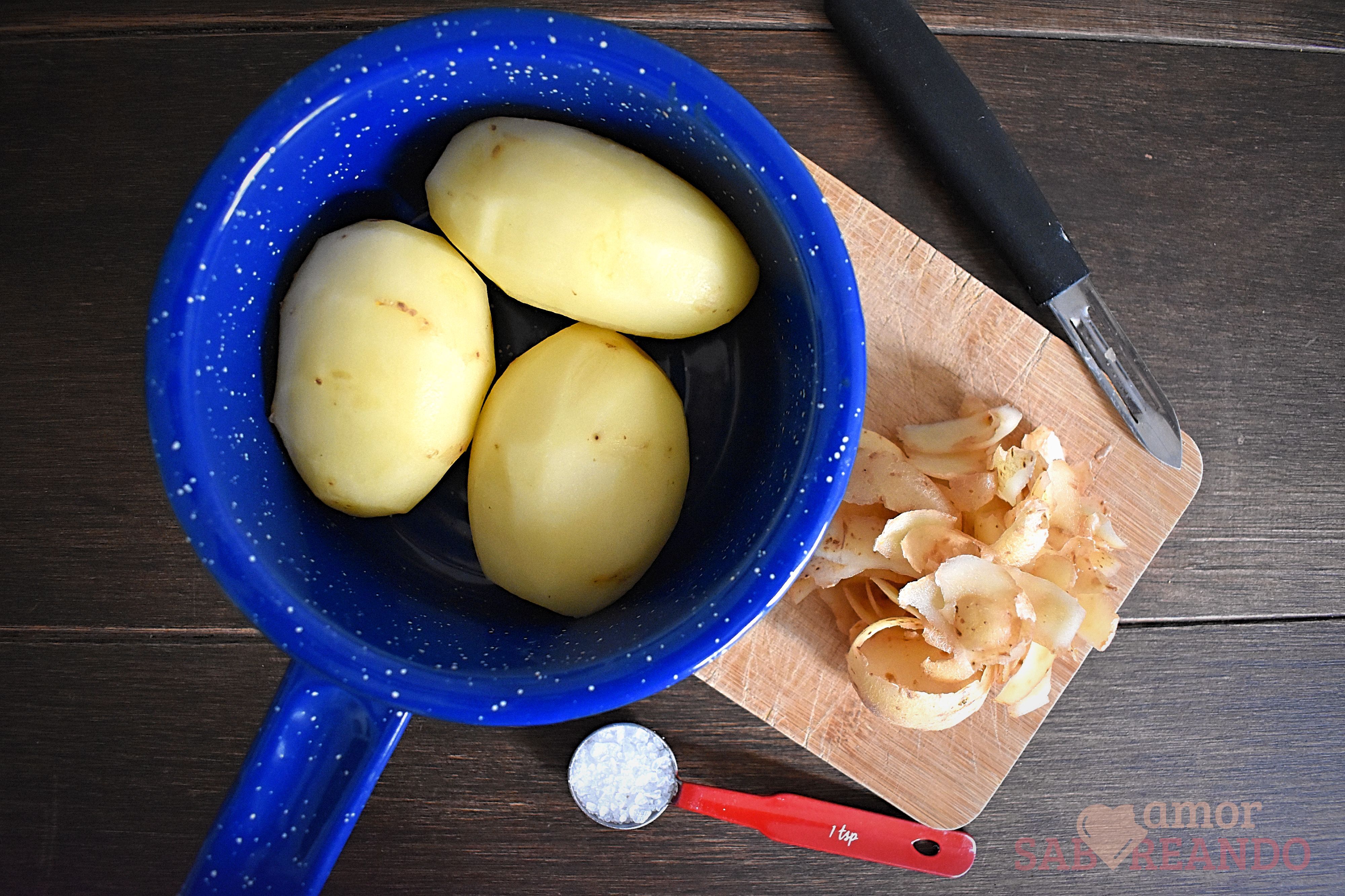 - Lava y desinfecta las papas. Una vez que lo hiciste pélalas, ponlas en una olla con agua suficiente para que las cubra, añade la cucharadita de sal y hiérvelas a fuego medio. Estarán listas cuando al insertar un cuchillo este se deslice con facilidad. Deja que se enfríen un poco y hazlas puré.