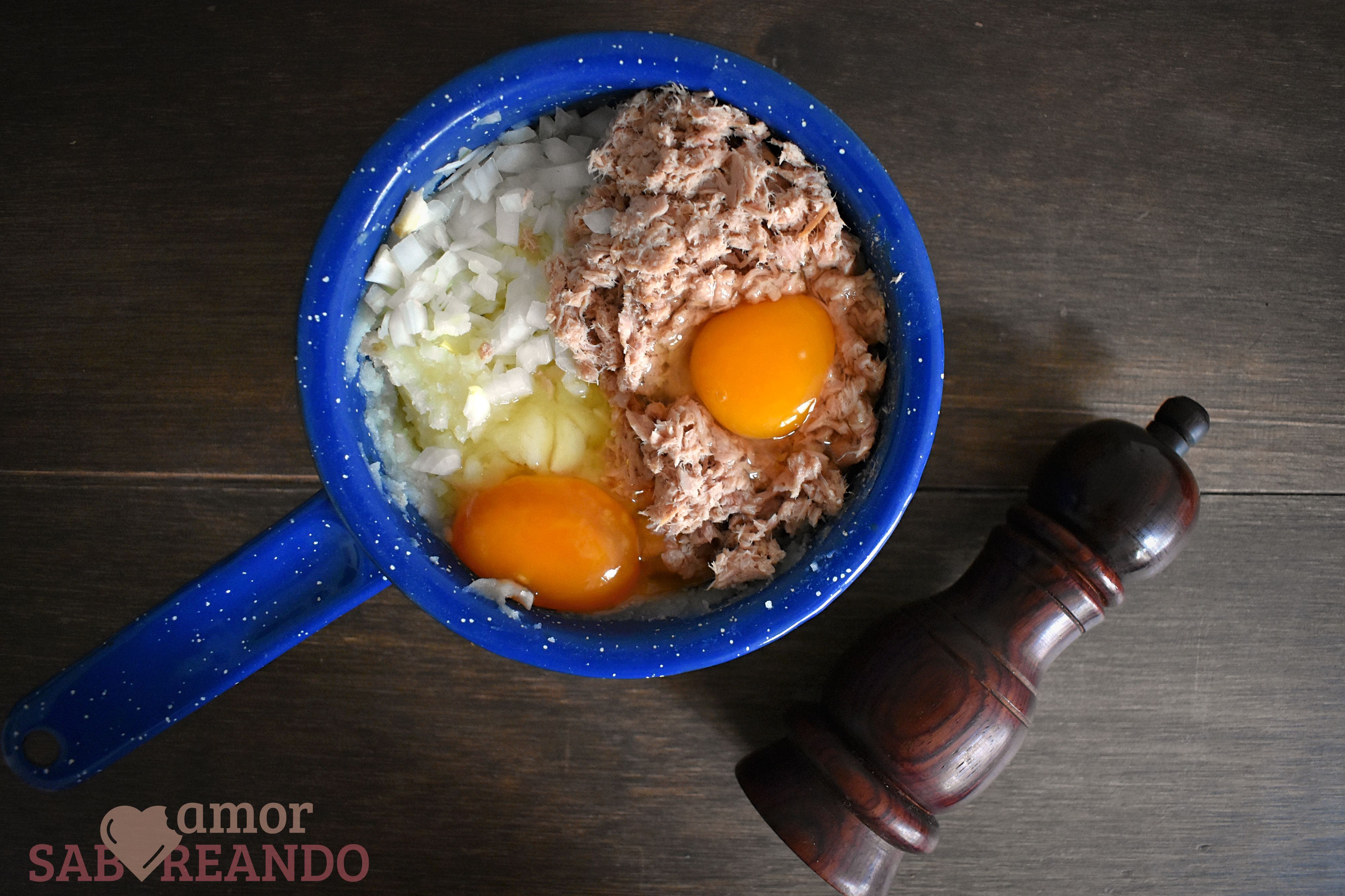 - Añade los huevos y mezcla bien. Yo pruebo la mezcla antes de añadir el huevo para rectificar el sazón.