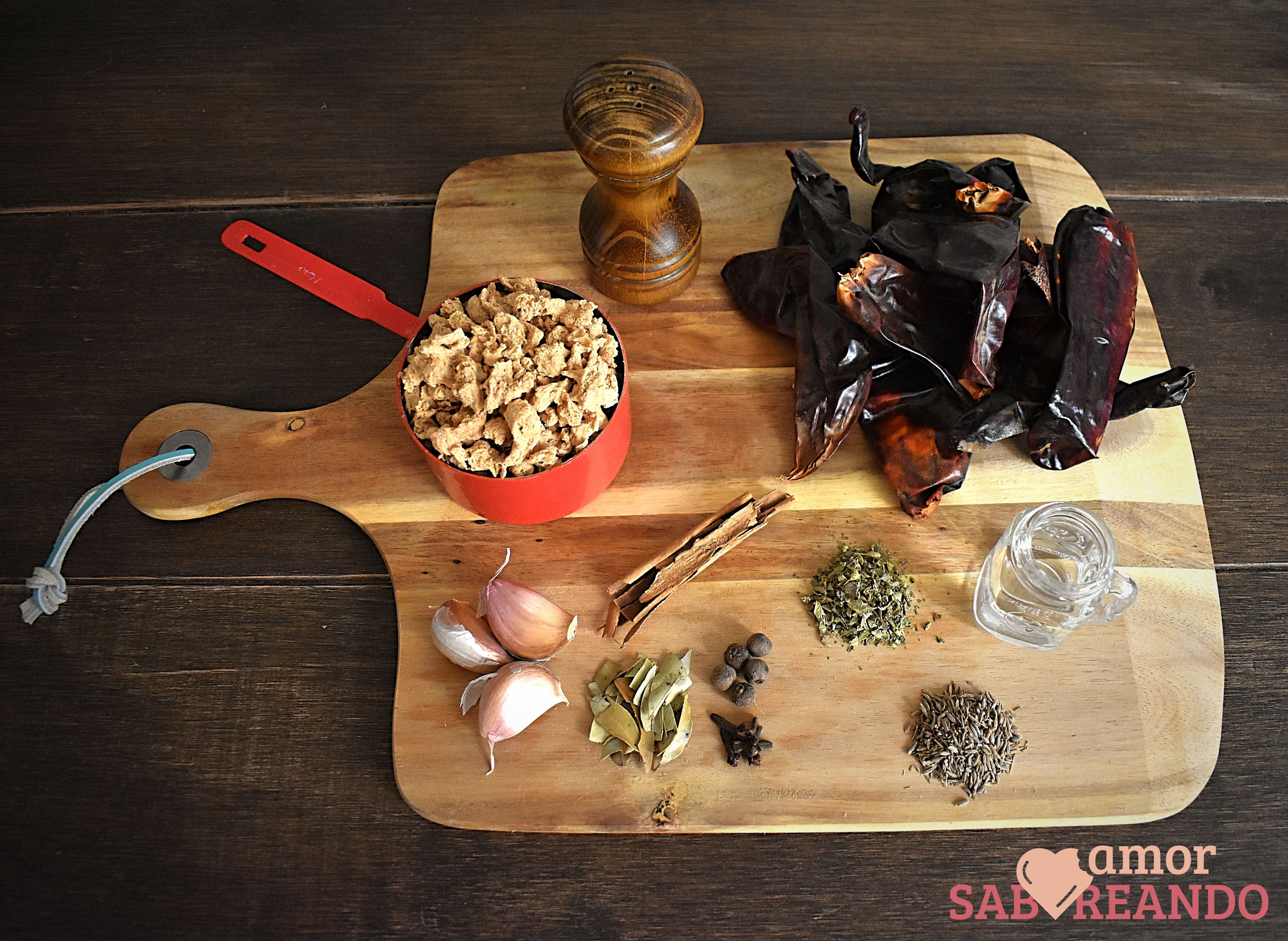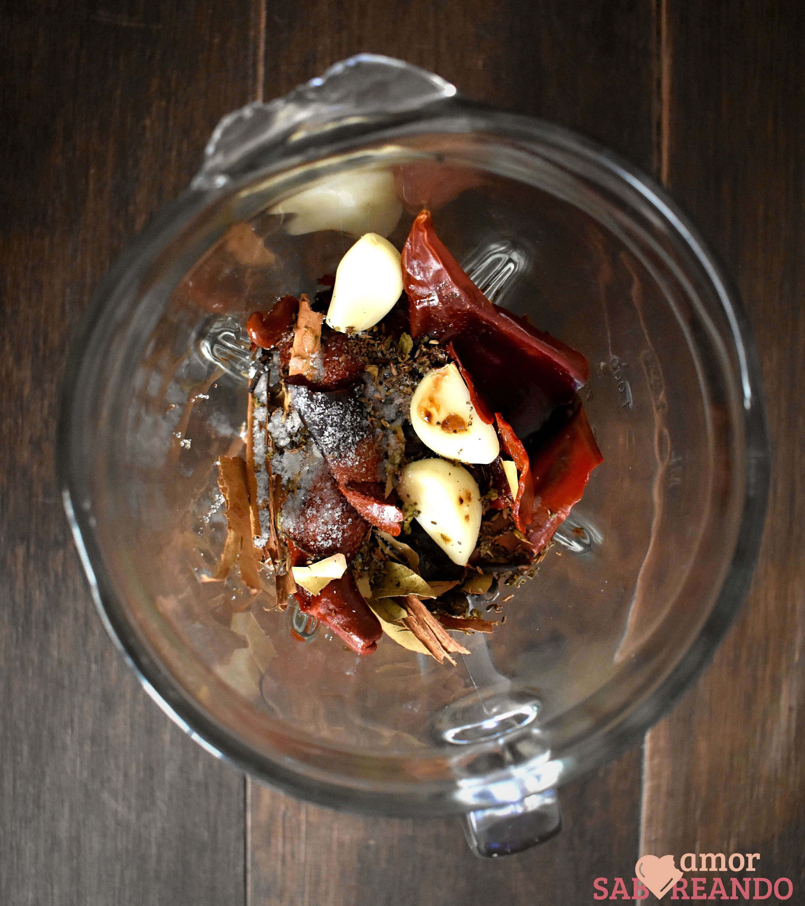 - En el vaso de la licuadora, vacía los ingredientes que tostaste junto con las pimientas, clavos de olor, orégano, comino, laurel, vinagre, sal y 1/2 de taza de agua tibia (yo he ocupado del agua en que se hidrató la soya) y licúa perfectamente. Si ves que la licuadora se atasca, detenla, revuelve un poco la mezcla con ayuda de una palita o cuchara y vuelve a licuar, pero no agregues más agua, ya que la textura que necesitas es espesa, como de una papilla.