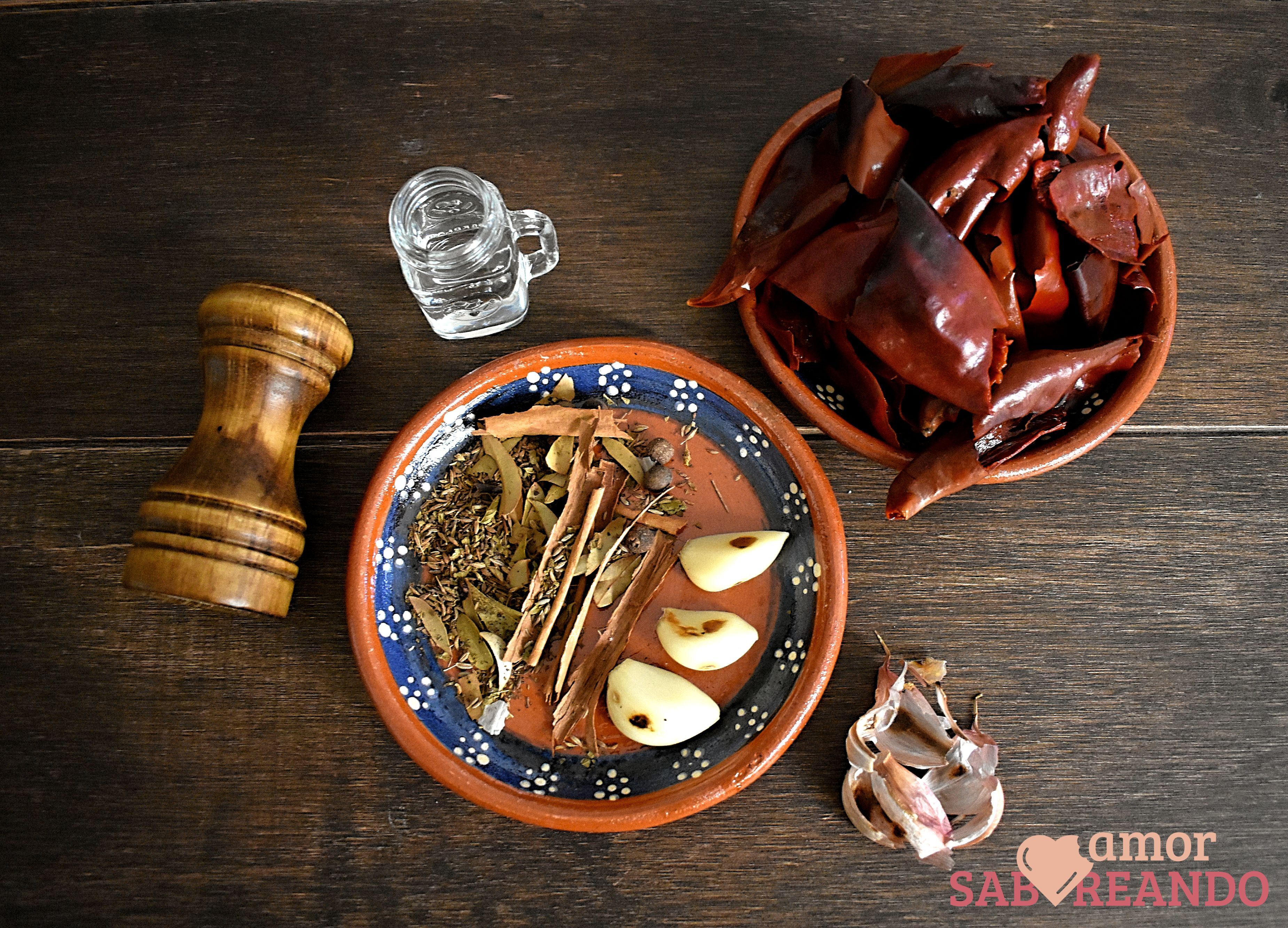 - En un comal a fuego medio-bajo, tuesta los chiles (retira las venas, semillas y rabo antes de tostarlos), los dientes de ajo y la canela cuidando que no se quemen.