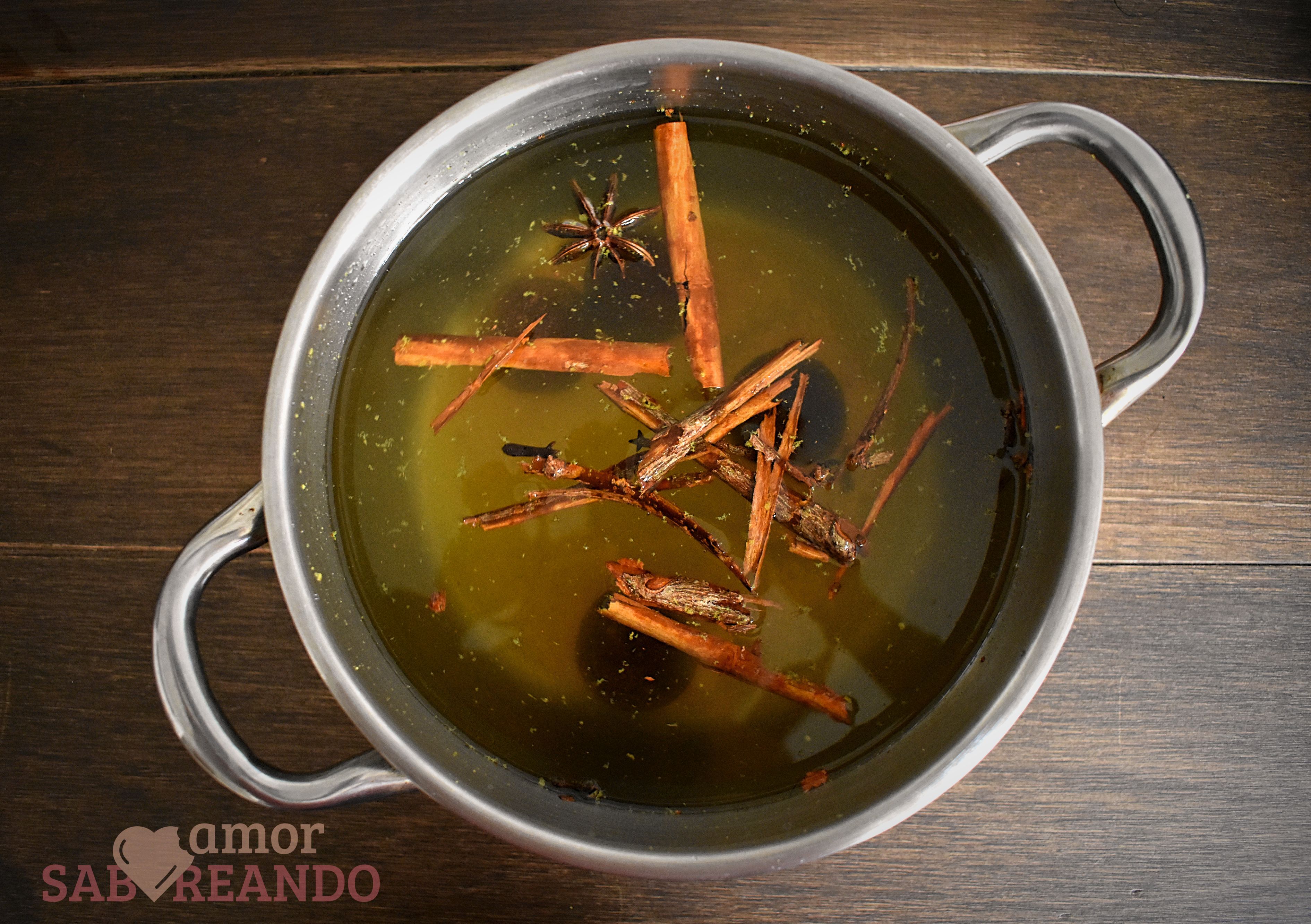 - En una olla o cacerola, coloca el agua, piloncillo, canela, clavos, anís y la ralladura de naranja y llévala a fuego medio hasta que el piloncillo se disuelva.