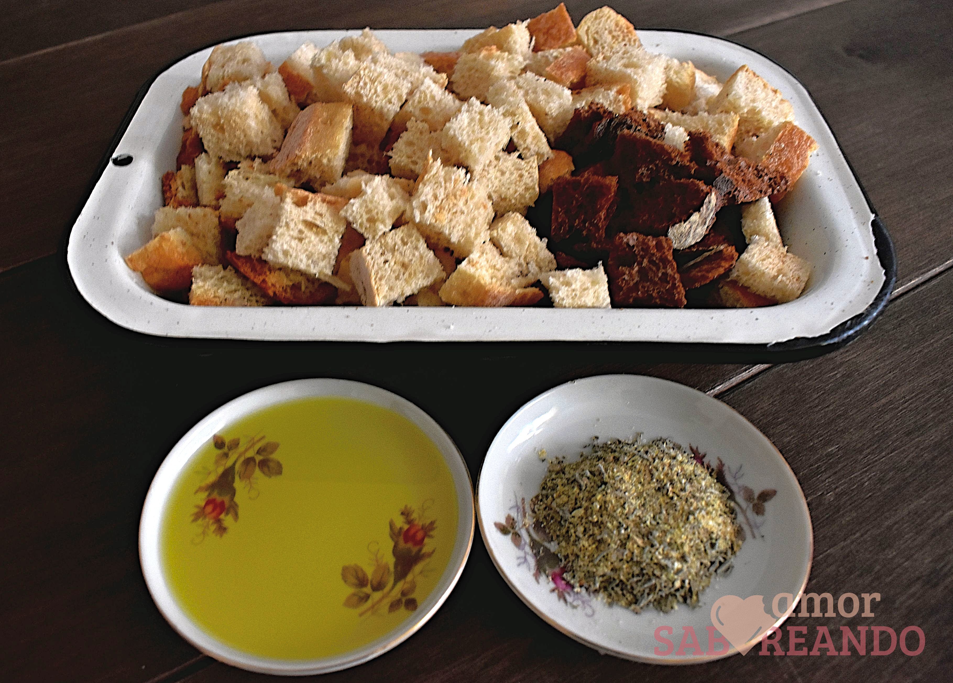 - Rocía los cubos de pan con el aceite de oliva, agrega la mezcla de hierbas y mezcla bien con tus manos.