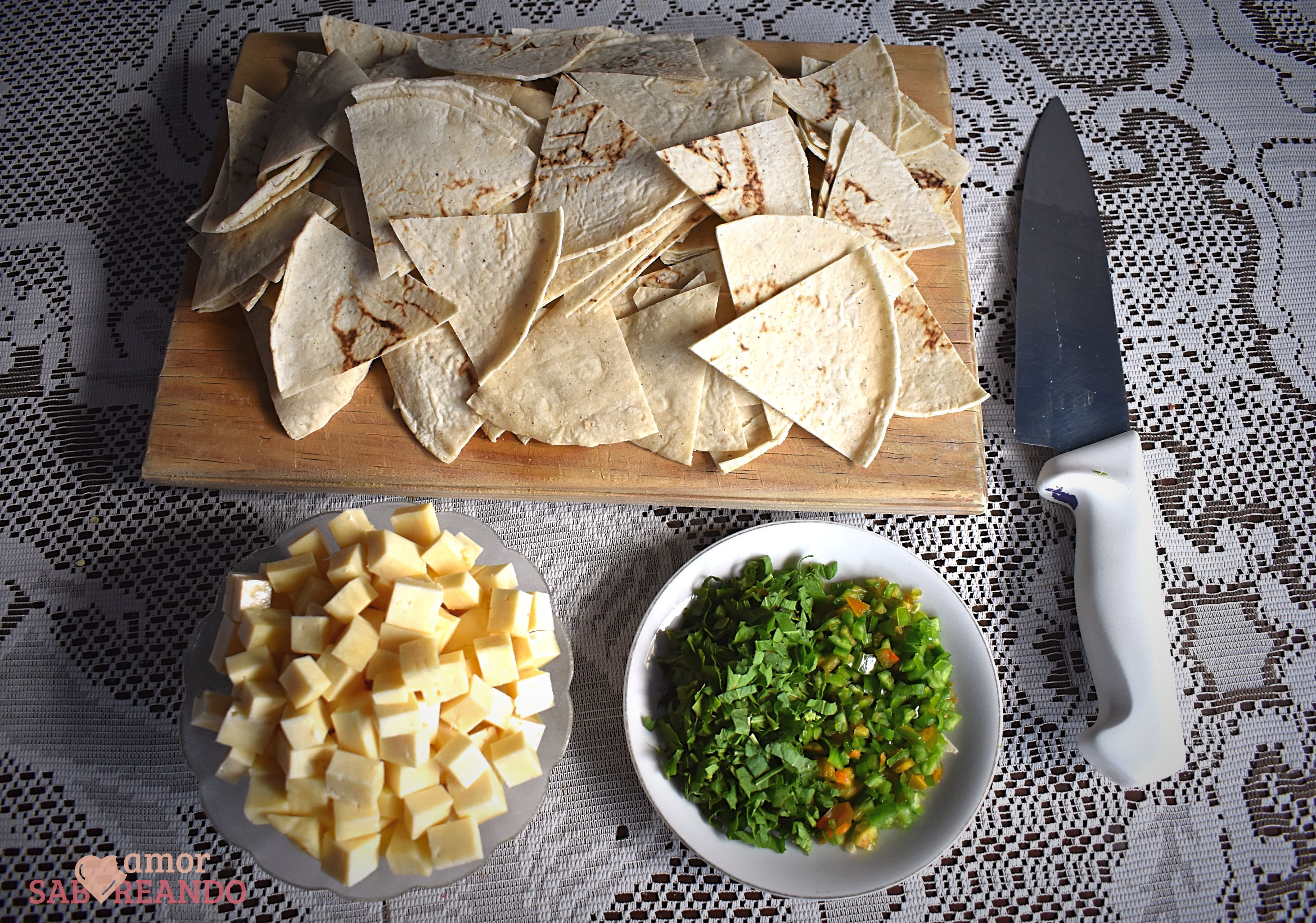 - Parte las tortillas en triángulos a manera que salgan 6 triángulos de cada tortilla, pica el queso en cubitos de medio centímetro, deshoja el epazote y pícalo. Reserva.
