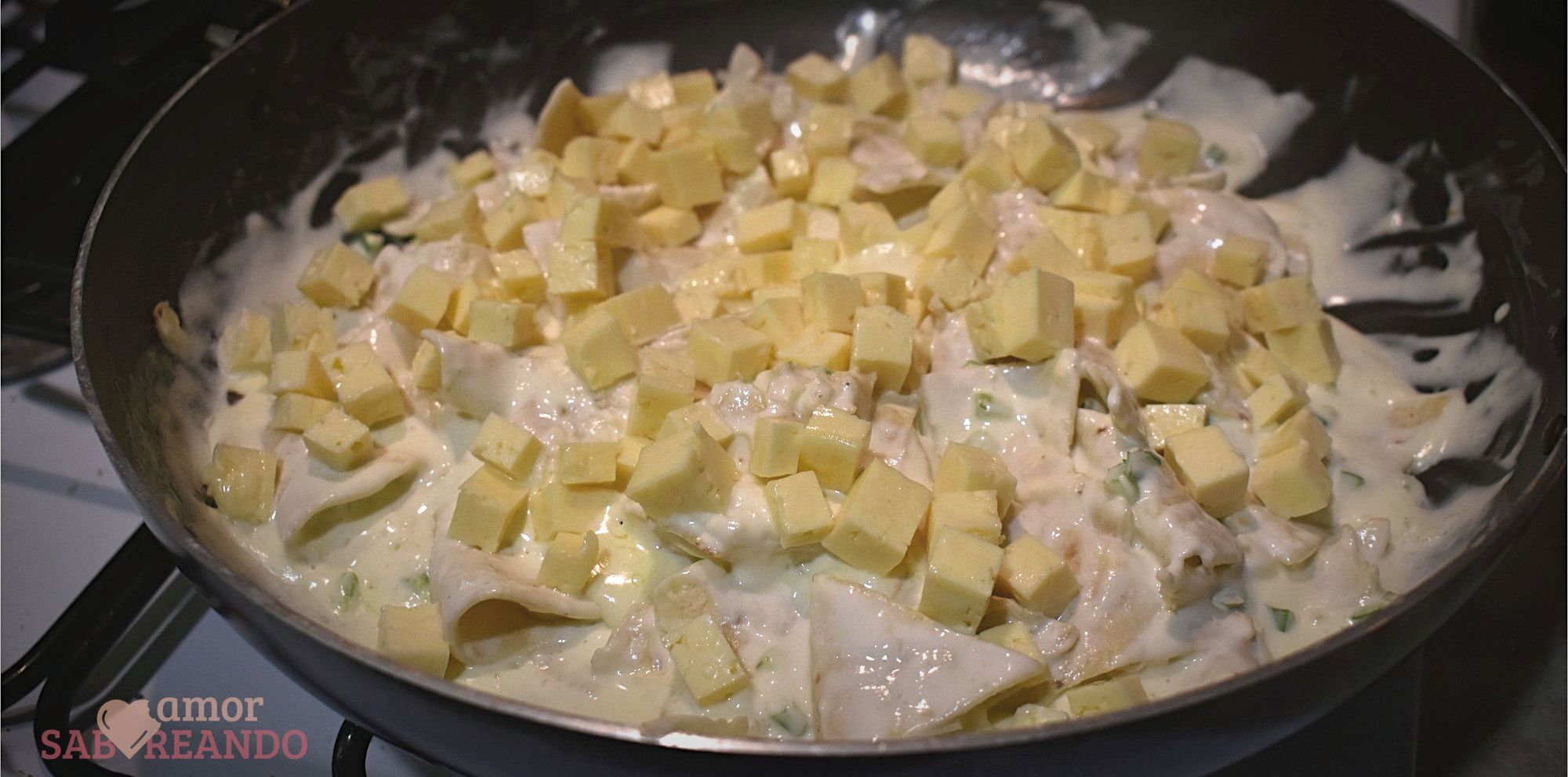 - Una vez que la crema comience a hervir, añade los cubitos de queso y sazona con sal al gusto, mezcla un poco para incorporar, rectifica el sazón y vuelve a tapar. Cocina por 5 minutos más.