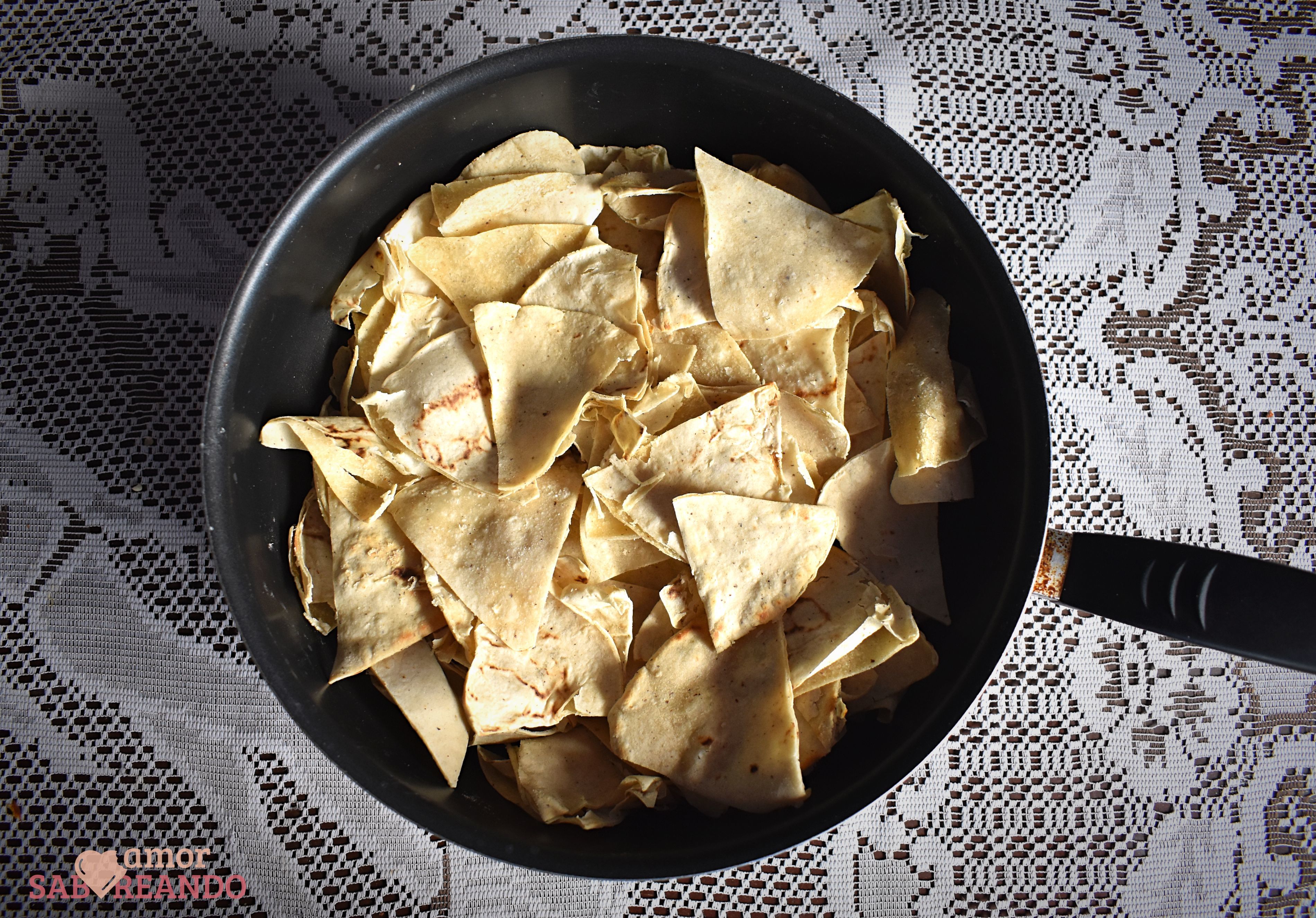 - Pon un sartén o cacerola a calentar y una vez caliente baja la flama y agrega las tortillas, dóralas a fuego medio cuidando que no se quemen. Ya que las tortillas estén ligeramente doradas incorpora la crema, tapa la sartén y cocina a fuego bajo por 5 minutos.