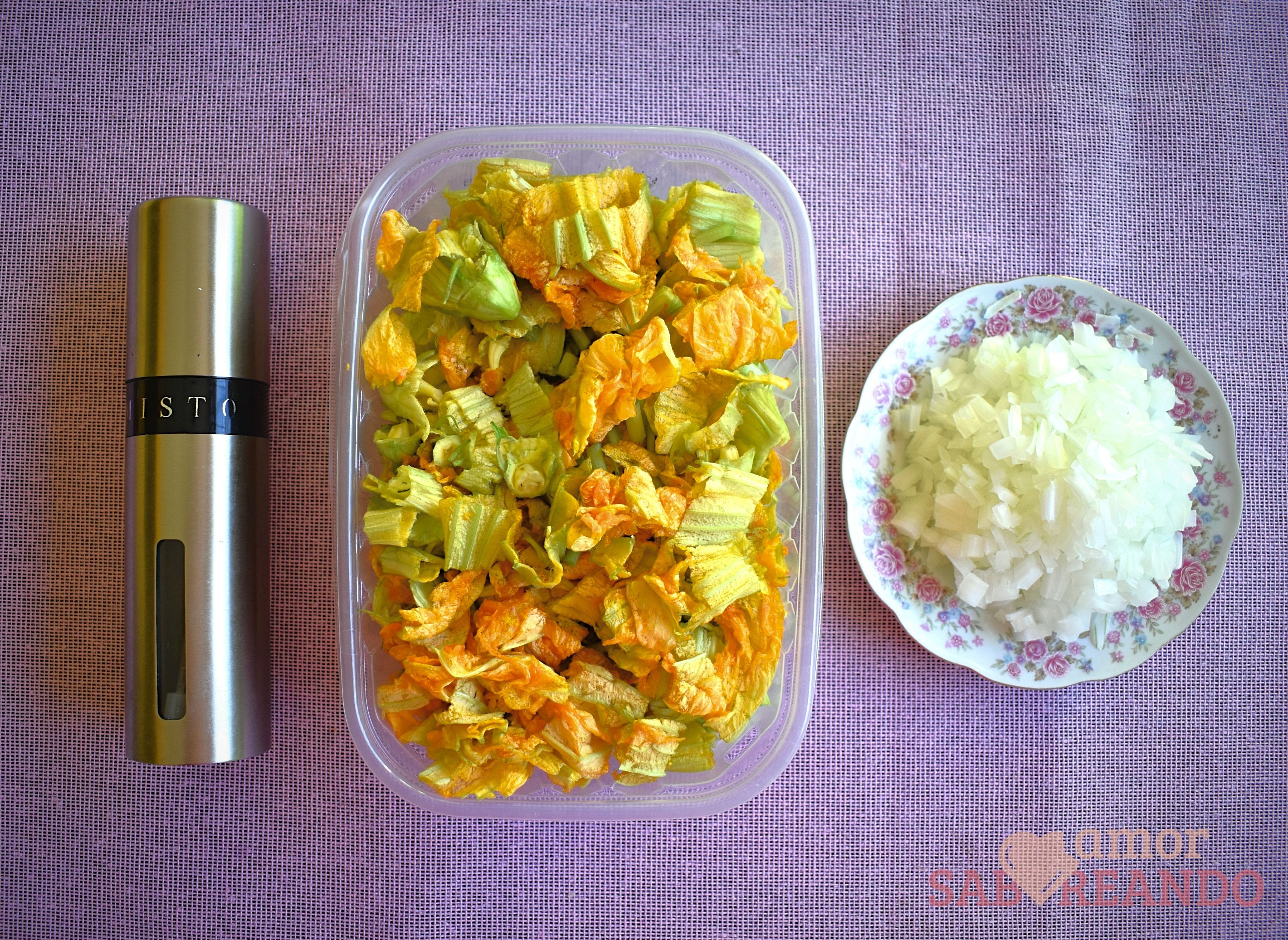 - Lava y desinfecta la cebolla y flores de calabaza. Recuerda lavar con cuidado las flores para que no se rompan y enjuágalas bien, pues suelen traer pequeños insectos en la zona del pistilo. Aparta 15 flores, te recomiendo apartar las que se vean más bonitas y grandes, el resto se usarán para el relleno.