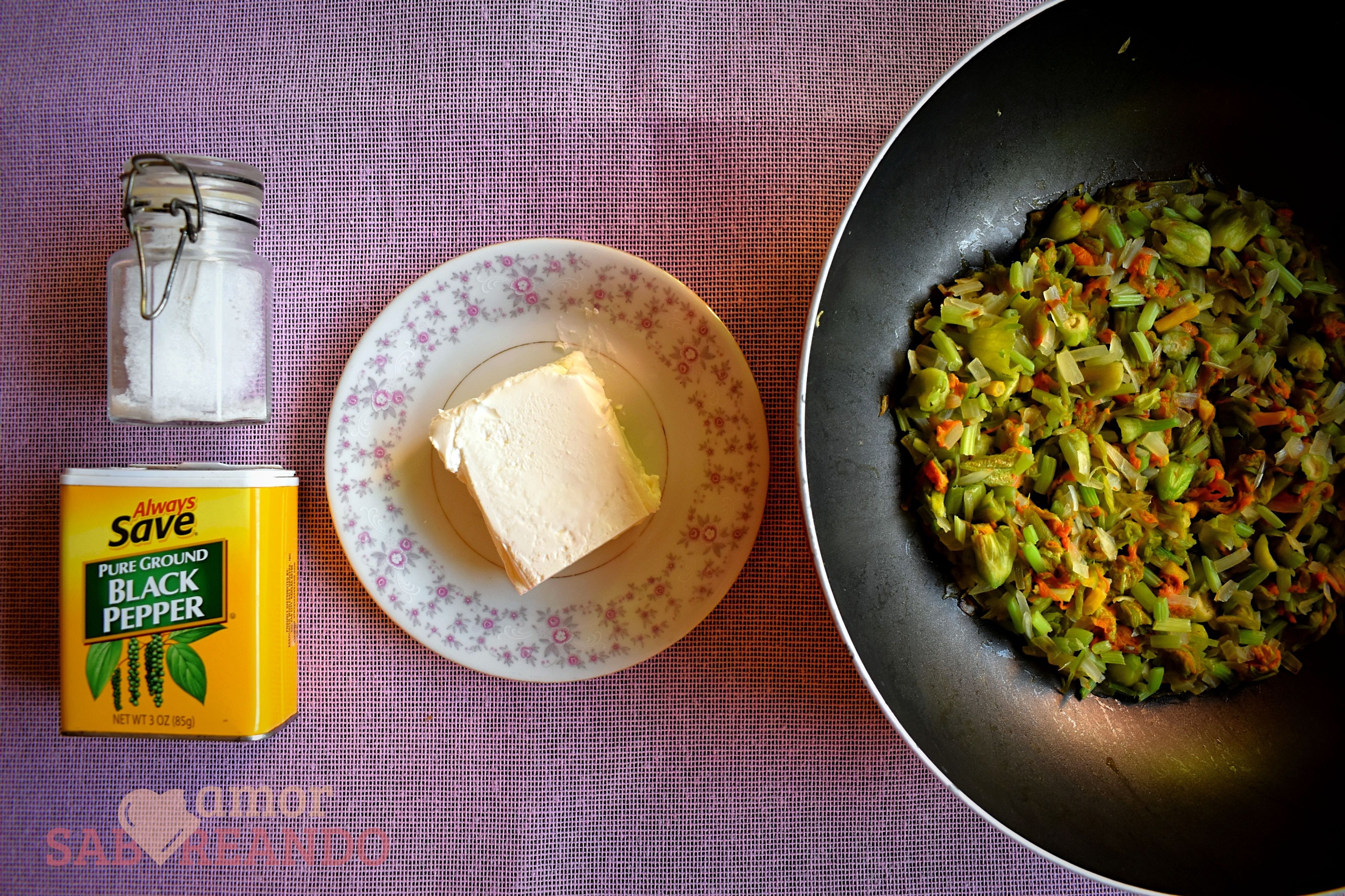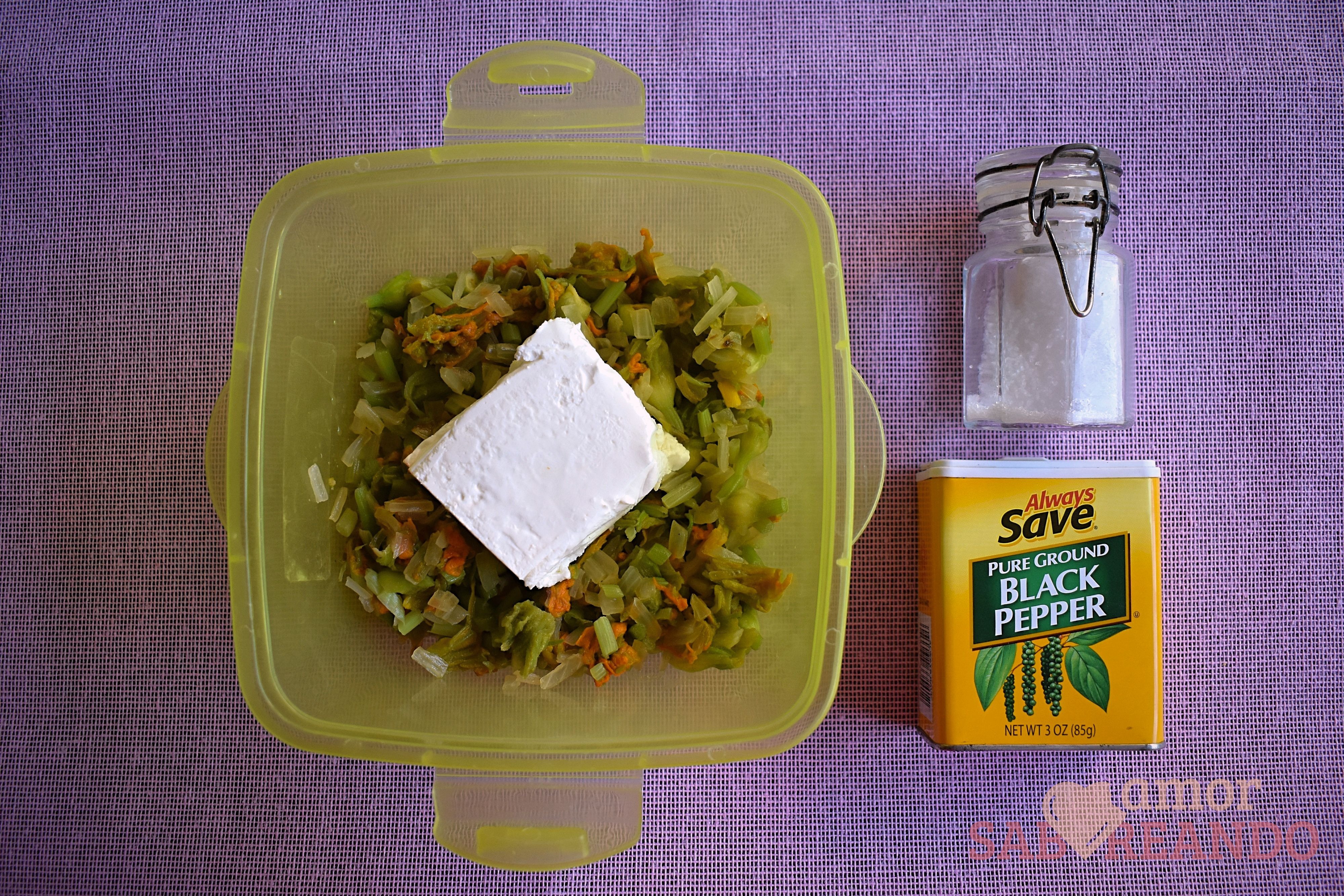 - Una vez que el relleno se enfríe pásalo a un recipiente, agrega el queso crema, sal, pimienta al gusto e integra hasta obtener una mezcla homogénea.