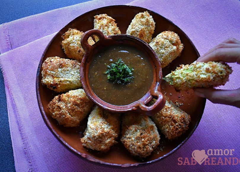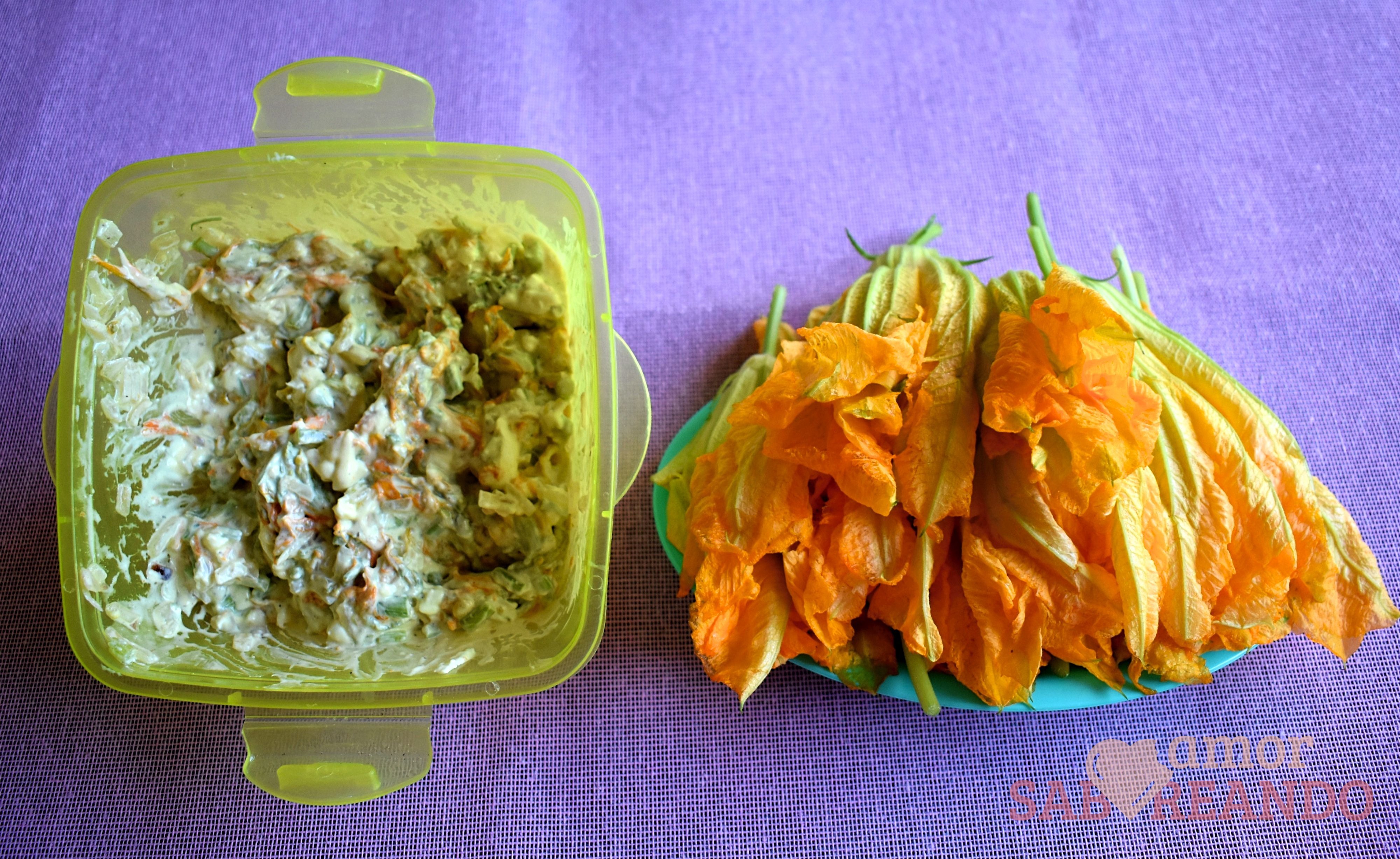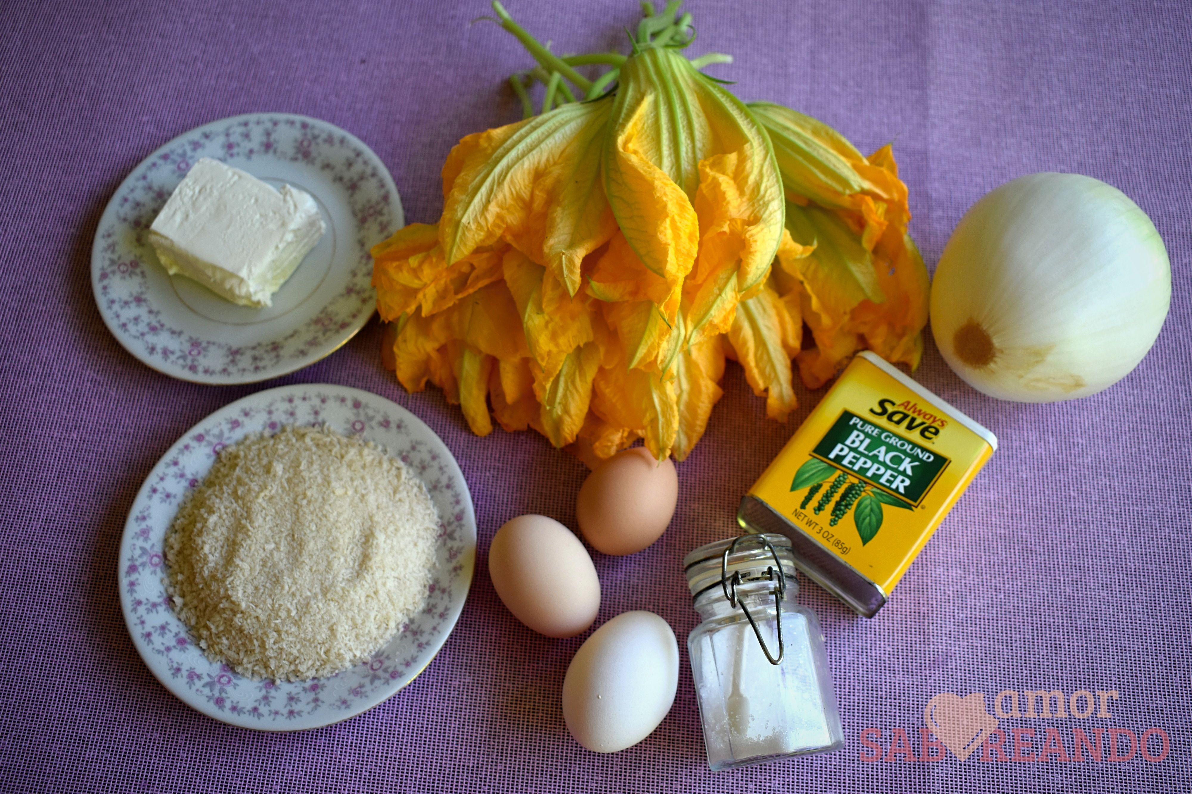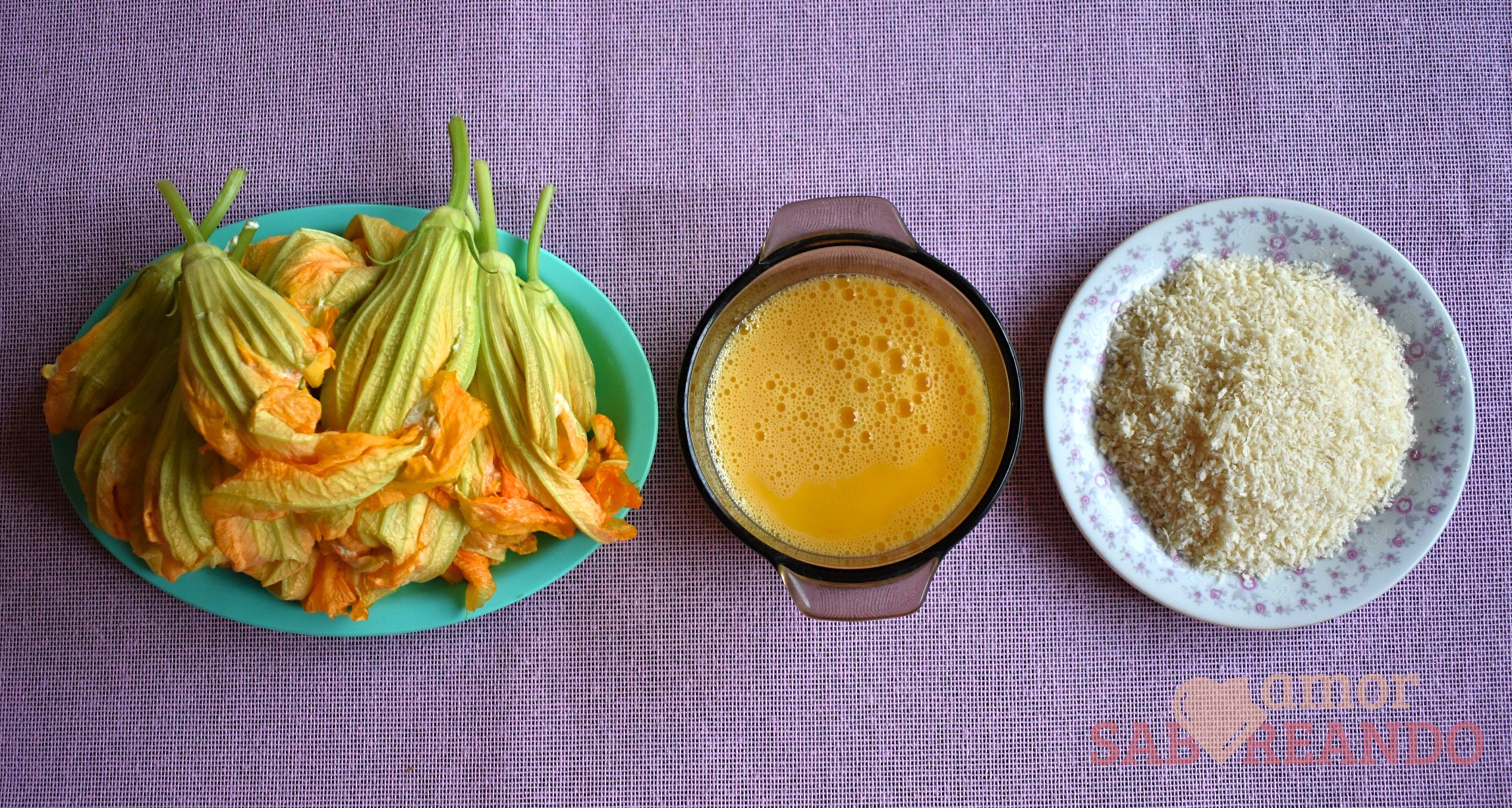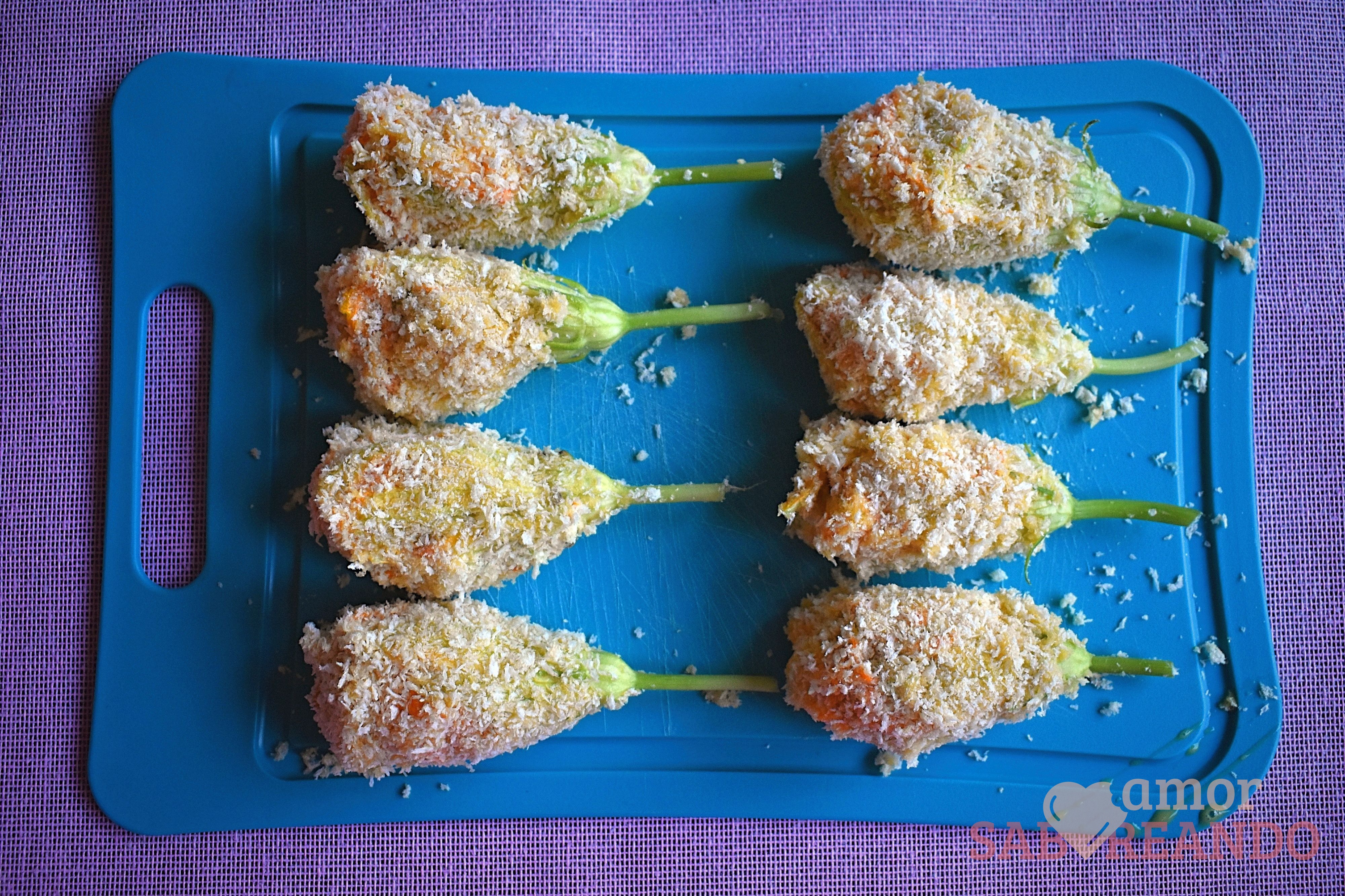 - Rellena con cuidado las flores, pásalas por huevo batido, después por el pan molido y fríelas en aceite caliente.