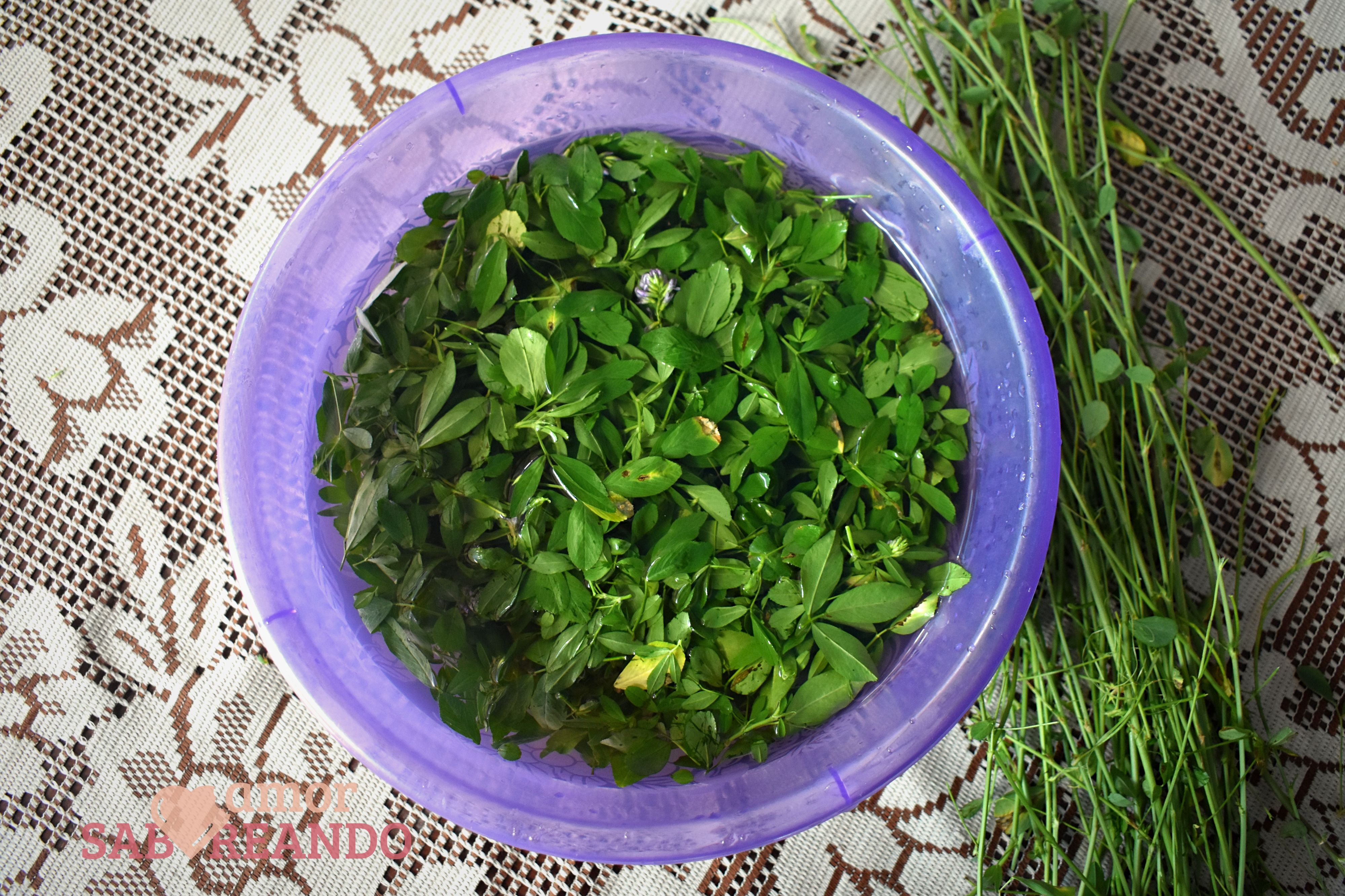 El jueves pasado que fuí al mercado municipal para las compras de la semana, me detuve en un puestecito que más bien era un tablón, un triciclo y un señor. Cuando me acerqué para comprar una calabaza, me percaté de que tenía varios manojos atados debajo de su mesita y le pregunté si era alfalfa, el me dijo que sí y yo, recordando lo mucho que tenía que no la comía no dude en traerme un gran manojo a casa.