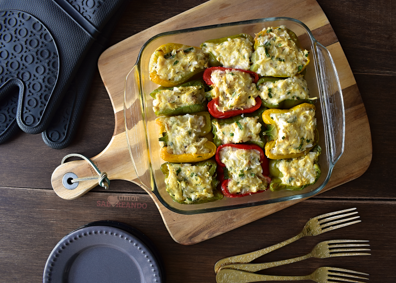 - Acomoda las mitades de pimientos en un refractario y distribuye el relleno en el hueco de los pimientos.