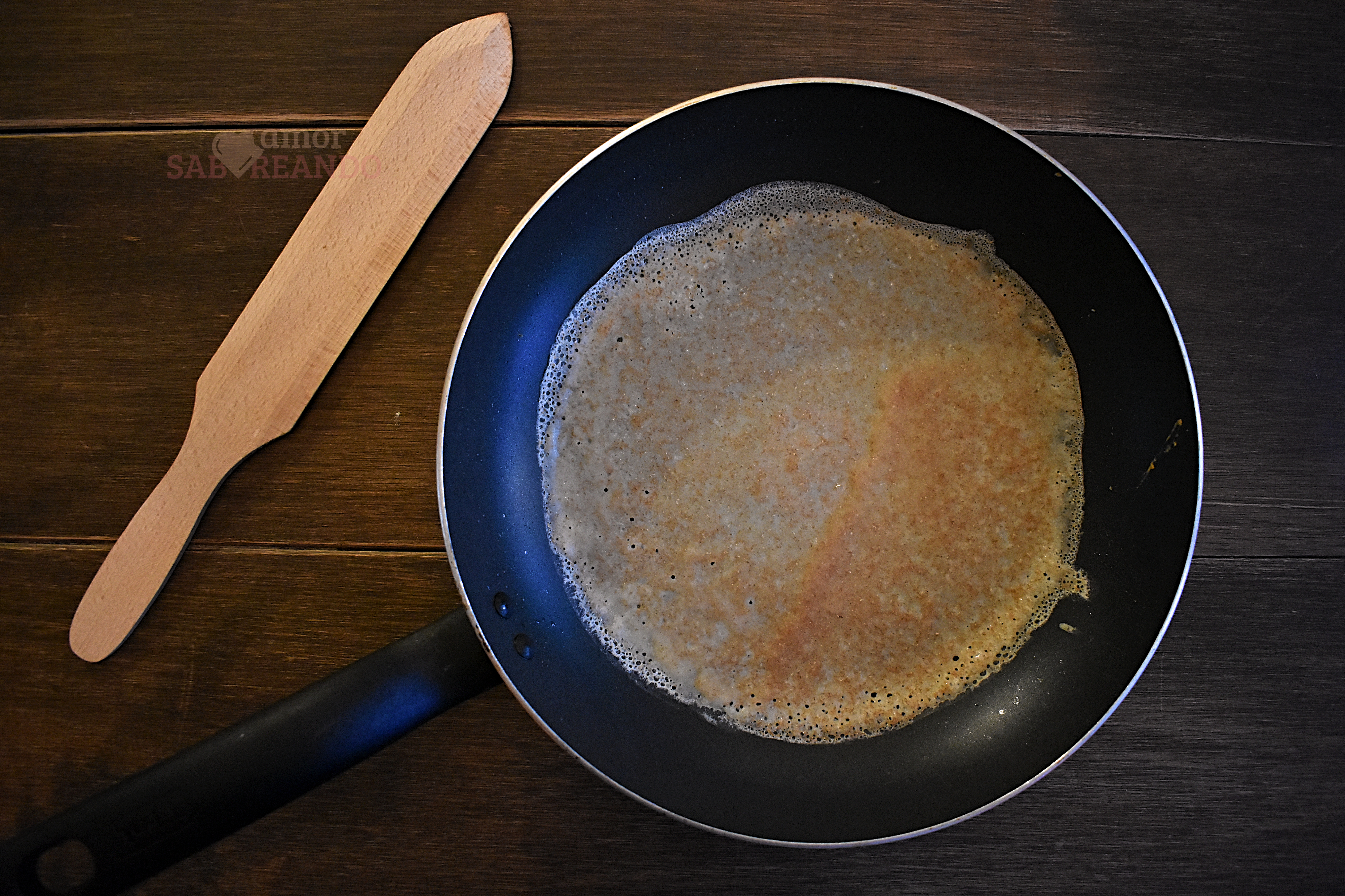 - Coloca en el sartén un cucharón de la mezcla de las crepas, toma el sartén del mango y mueve de manera circular para que la mezcla se extienda por toda la sartén. Si quedan huequitos en tu crepa, rellénalos con más mezcla ayudándote de una cucharita (o del cucharón, pero como mi pulso es de maraquero, si lo hago con el cucharón me paso de mezcla jeje).