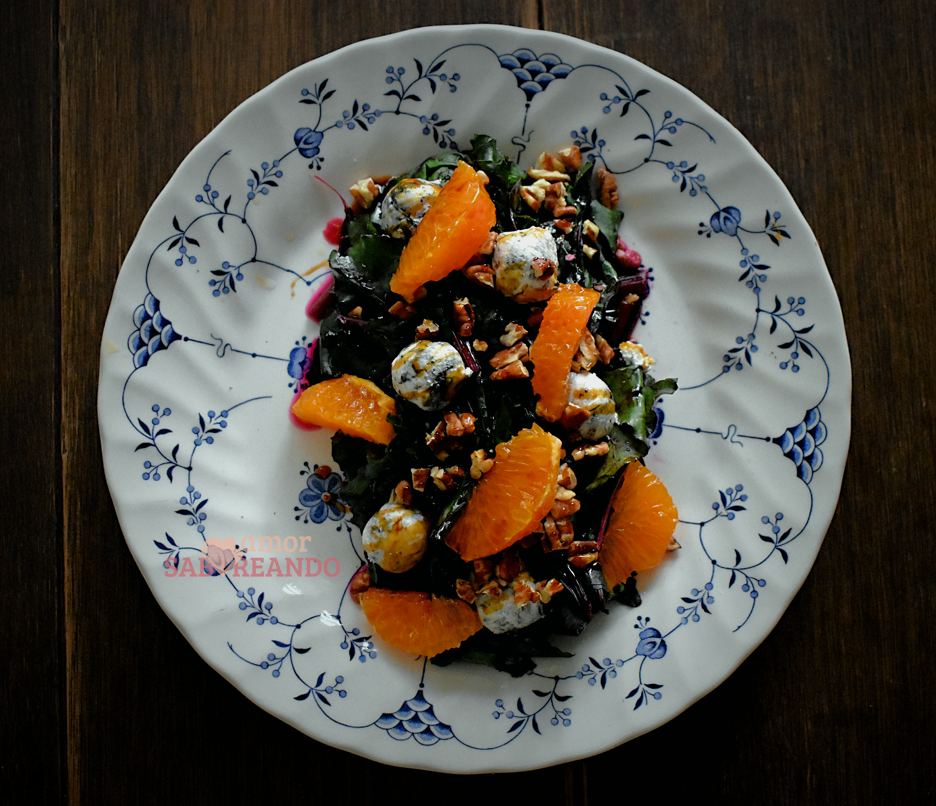 Esta ensalada tibia de hojas de betabel y mandarina queda muy bien como plato principal o como guarnición. El jugo de mandarina y la miel contrarrestan el fuerte sabor de las hojas de betabel logrando equilibrar el plato.