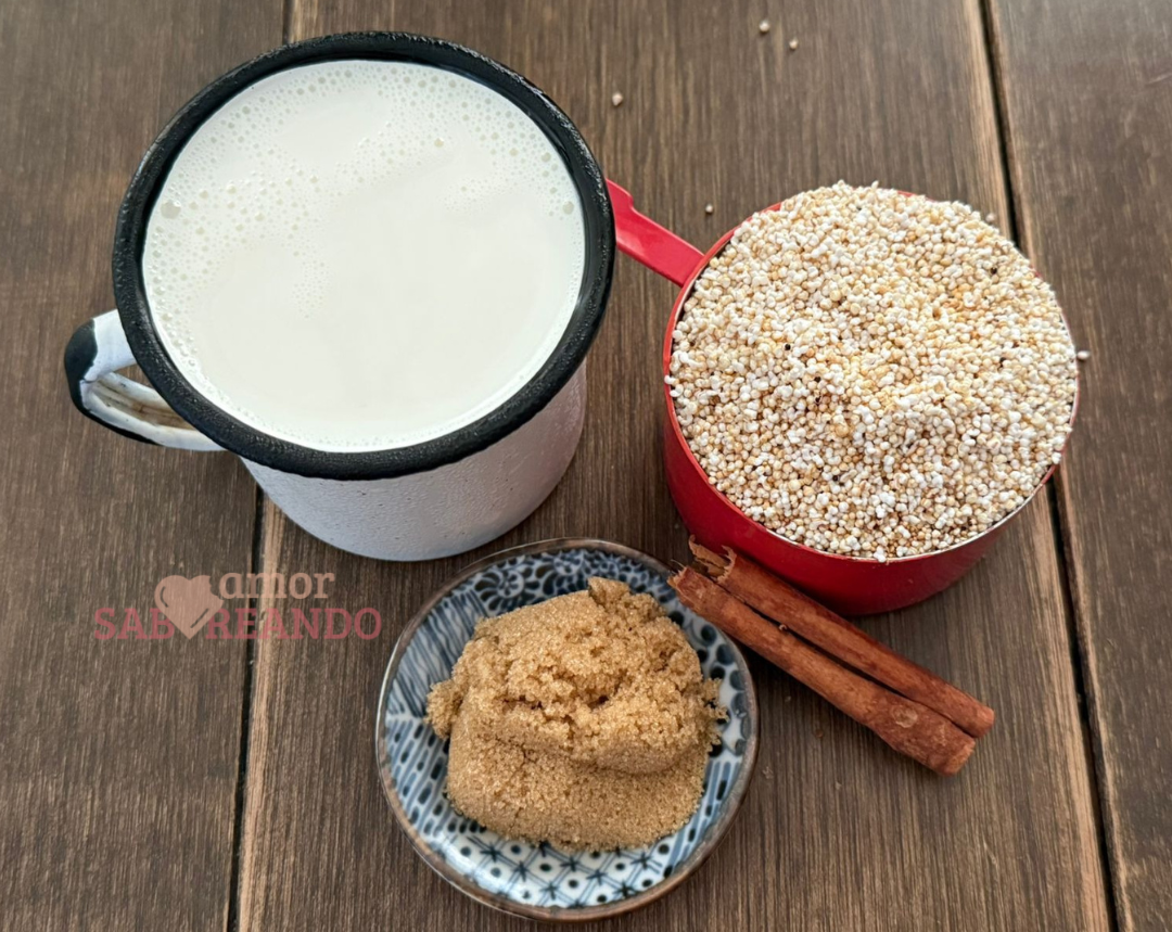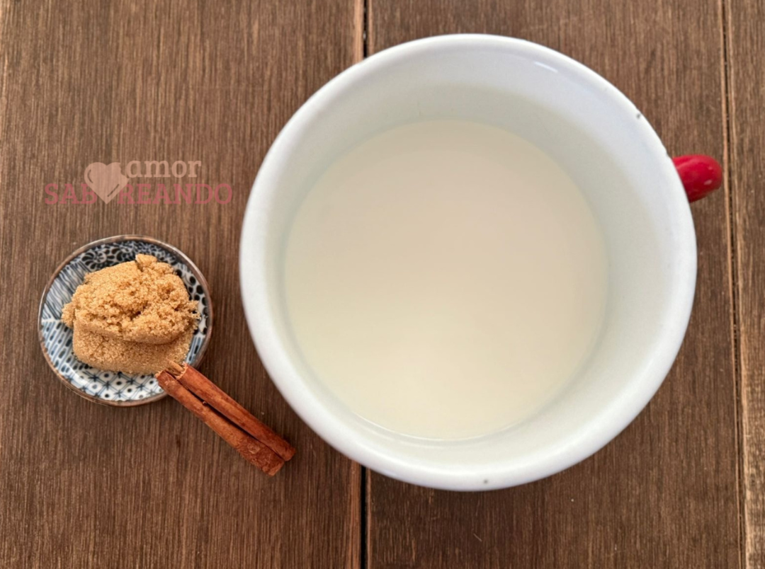 - Coloca la leche, agua, canela y azúcar en una ollita y lleva a hervir a fuego medio bajo. una vez que suelte hervor, apaga el fuego.