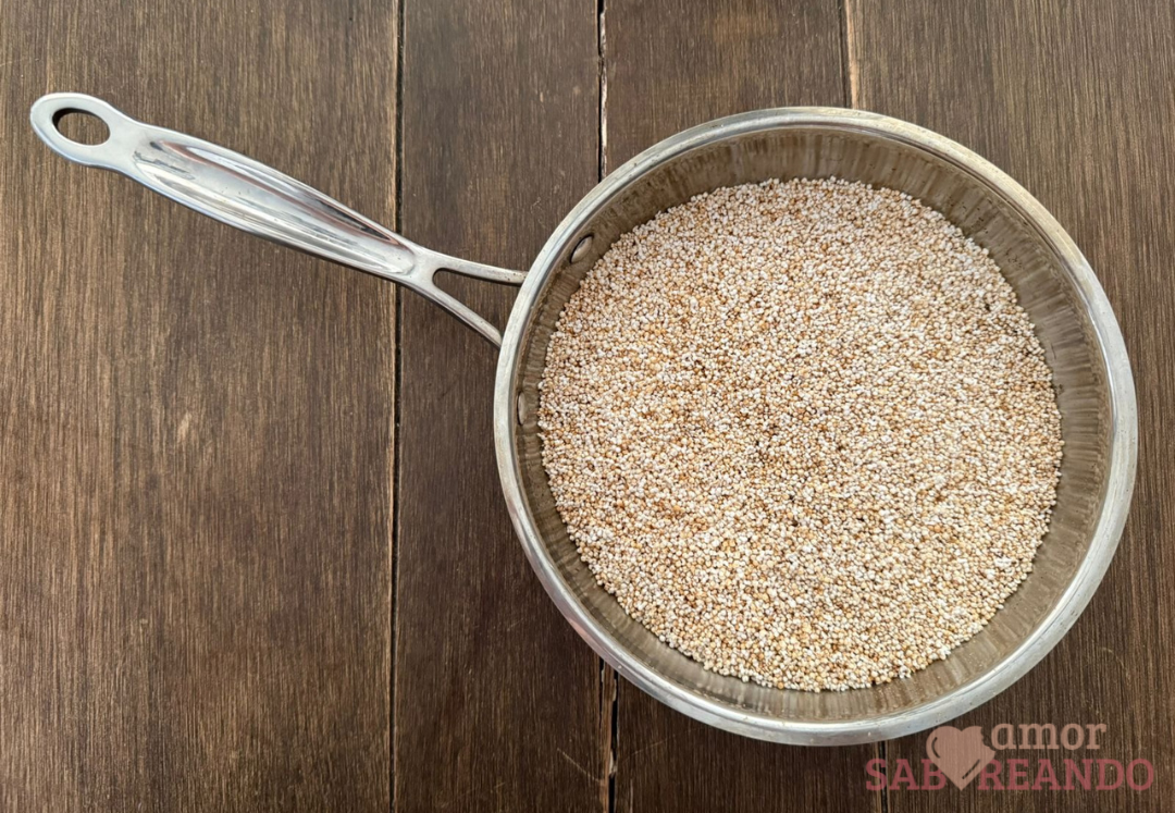 - En un comal o sartén a fuego bajo, tosta el amaranto por aproximadamente 10 minutos, no dejes de moverlo porque se quema con mucha facilidad y esto podría hacer que tu atole quede amargo.