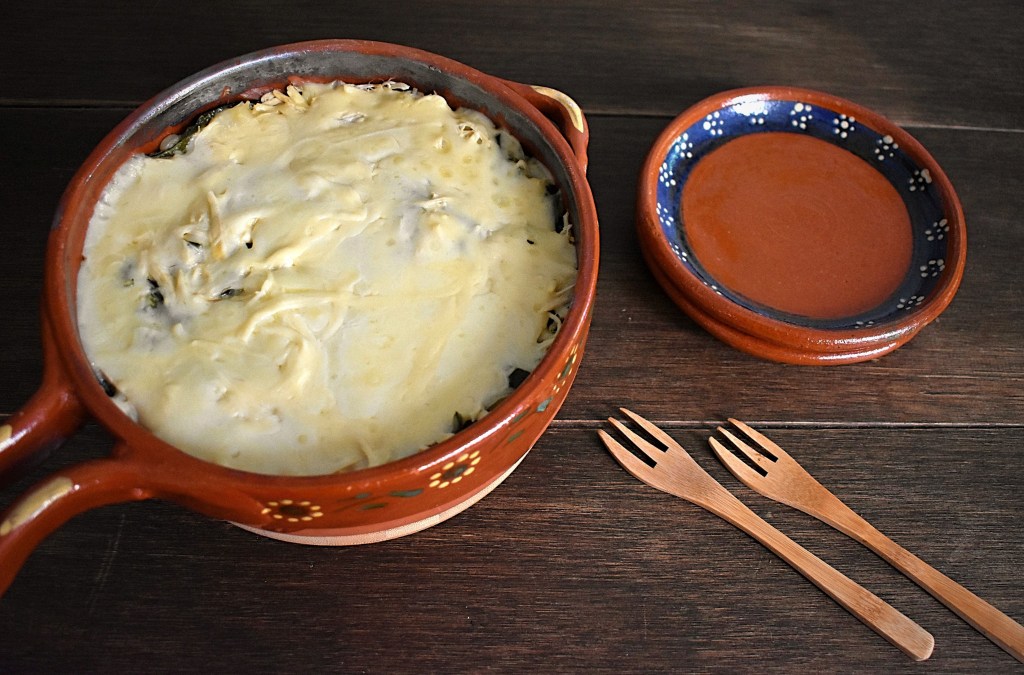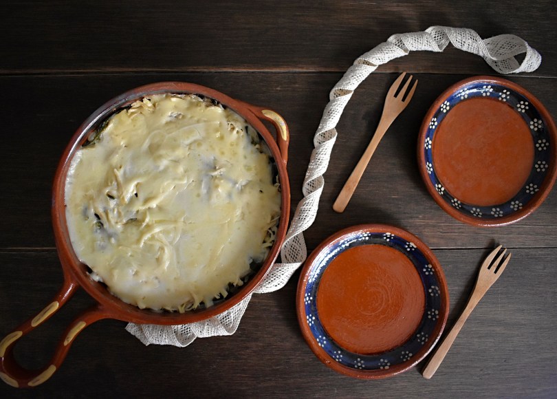 - Teniendo todo listo, comienza con el armado; en una cazuela de barro alterna capas de la siguiente manera: salsa, tortillas, salsa, rajas, pollo, crema y queso.