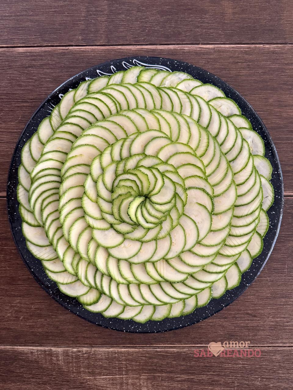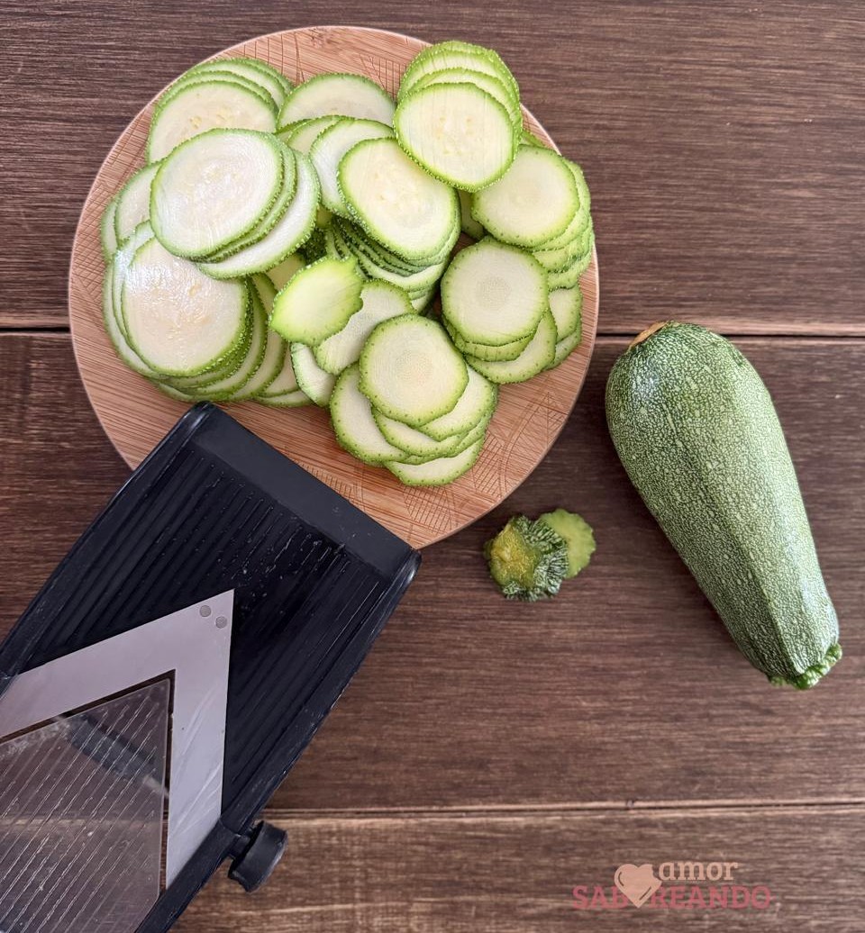- Con ayuda de una mandolina o un cuchillo afilado corta las calabacitas en rodajas delgaditas, de aproximadamente 3 mm y acomódalas en un platón grande de forma extendida.