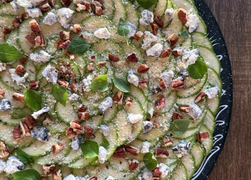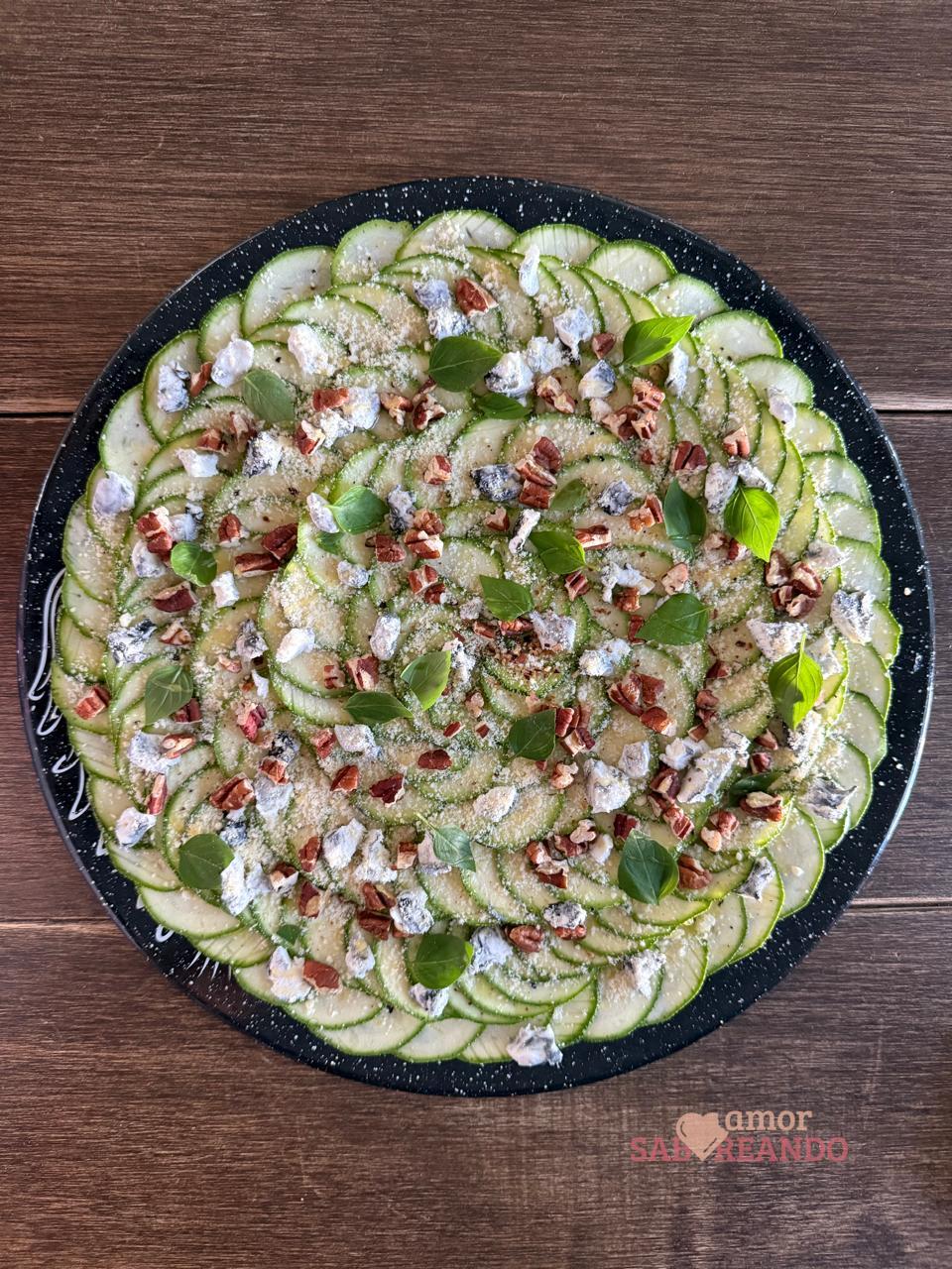 Este carpaccio de calabacitas queda increíble como entrada con unos tostones de pan de masa madre o pan pita, para acompañar unas pizzas o como guarnición de tu proteína favorita.
